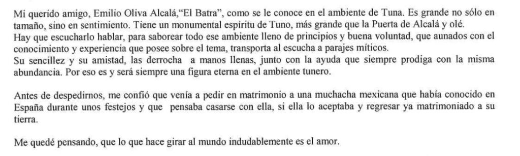 No he escrito un libro, aún, sin embargo me siento orgulloso de ser mencionado en los libros que alguno de mis compañeros de vida y tunos han escrito y es por ello que también quiero dejar legado de sus memorias, pues sin ellas, la tuna a día de hoy no sería mas que un recuerdo antiguo, mencionado en algún que otro libro de historia.